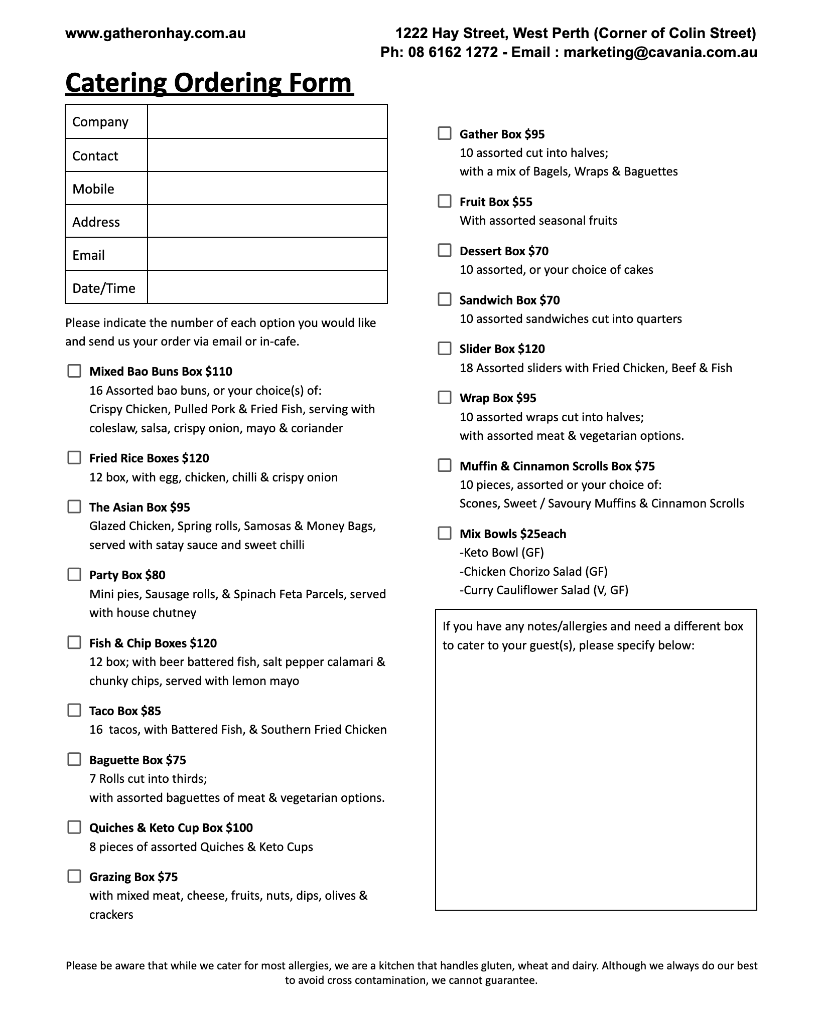 Indulge in our delicious offerings and elevate your gatherings with Gather on Hay's catering service.